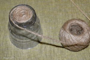 На донышко пластмассового стаканчика намажьте клей, и приклейте шпагат, выкладывая по кругу от центра.