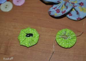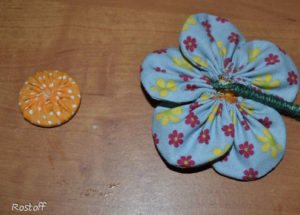Для сердцевины цветочка обтягиваем пуговицу лоскутком ткани. На фото представлены два варианта обтяжки. 1-ый вариант неверный, так как сердцевина выходит недостаточно законченной.