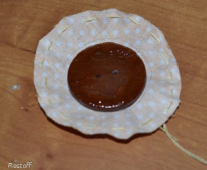 Для правильной стяжки пуговицы по кругу прогуляйтесь стежками, намажьте пуговицу клеем и стяните ткань, затянув нитку.