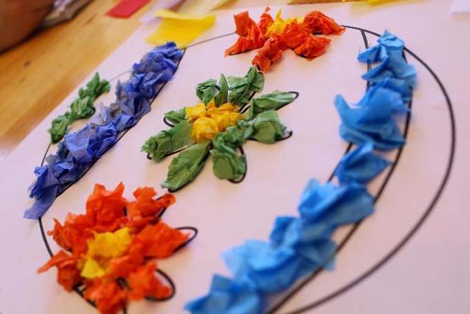 3. Сомните все квадратики гофрированной бумаги и начните их аккуратно приклеивать поверх нарисованных узоров.